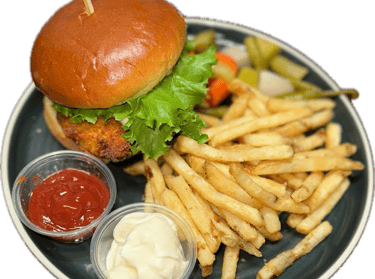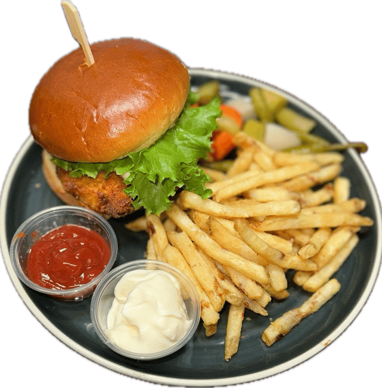 Beef or Chicken brioche bread stuffed with cheese, lettuce, tomatoes, mayonnaise, and ketchup served with fries