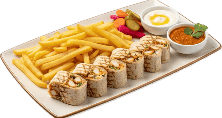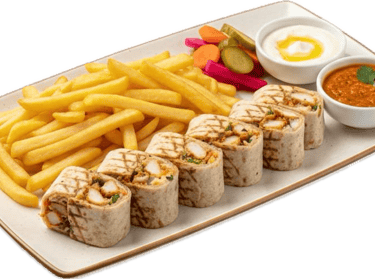 Wrapped Shawarma In a toasted tortilla bread served with french fries, garlic sauce, spicy garlic sauce, and pickles served with fries